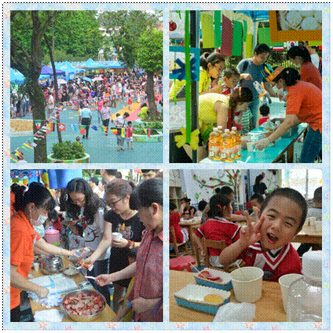 品尝各国美食是广外幼儿园每年六一活动的例牌项目,今年也不列外,演出结束后,孩子们和家长回到幼儿园,一起品味各式大餐。幼儿园彩旗飘飘,热闹非凡,八个国家的美食摊位各具特色:中式烧卖、韩国炒年糕、俄罗斯红肠、巴西烤肉、美式热狗、蜂蜜柚子茶、泰国椰子水......各国特色美食让大家大快朵颐。