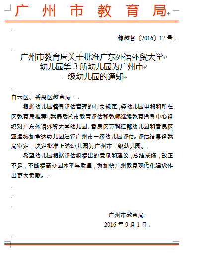 近日,广州市教育局公布了幼儿园等级评估结果,我园被批准为广州市一级幼儿园。