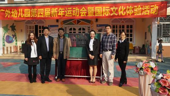 接着是市一级园牌匾的揭牌仪式,由新市教育指导中心主任黄晓波、教育集团总经理孙建军、广外附属中小学校长吴玉爱、园长周宇、执行园长曾晓杰、副园长张惠芬共同揭开市一级牌匾。