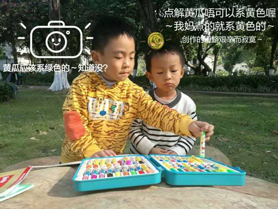 枫枫:轩轩,你在画什么?啊~哈哈~黄瓜不是黄色的,应该是绿色的!知道吗?